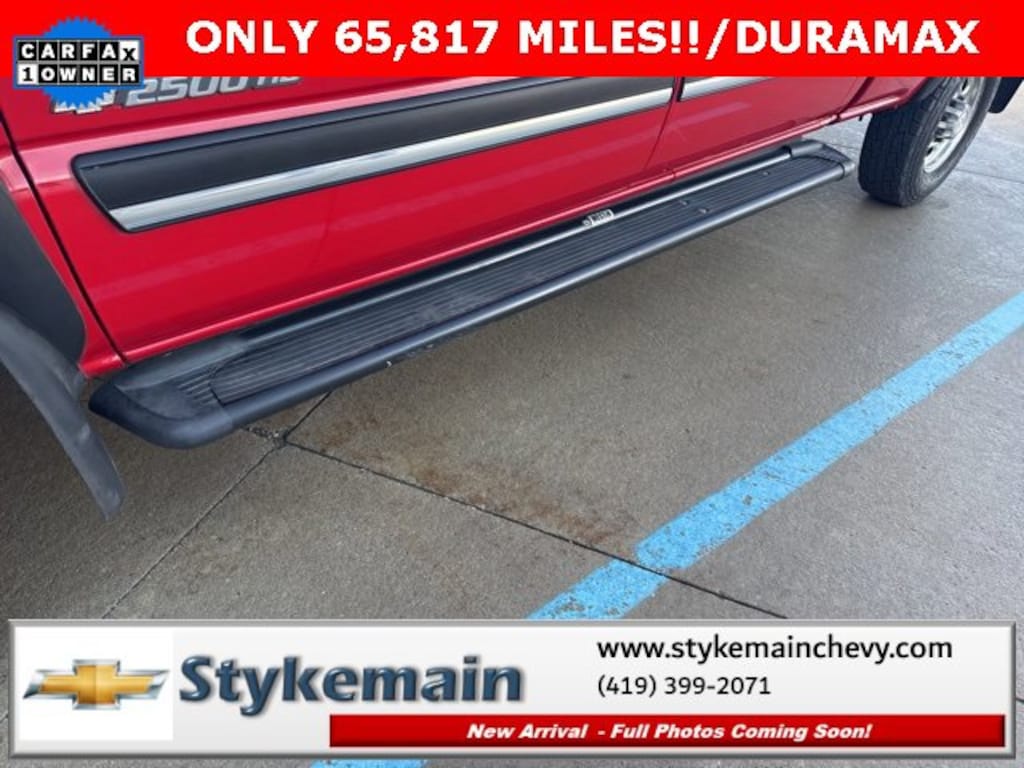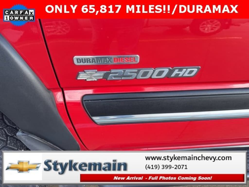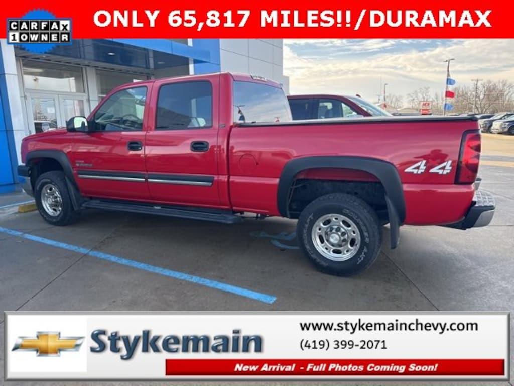 2005 Chevrolet Silverado 2500HD LT ONLY 65,817 MILES!! CREW DURAMAX Victory Red ** CALL TODAY 419-399-2071 **, ** ASK US HOW YOU CAN EARN $50 JUST TO TEST THIS VEHICLE! **, ** 4WD **, ** DIESEL **, ** DURAMAX **, ** CLEAN VEHICLE HISTORY...NO ACCIDENTS **, ** ONE OWNER **, Silverado 2500HD LT ONLY 65,817 MILES!! CREW DURAMAX, 4D Crew Cab, Duramax 6.6L V8 Turbodiesel, Allison 1000 5-Speed Automatic, 4WD, Black Leather-Wrapped Steering Wheel Rim, Black Power Folding Outside Rear-View Mirrors, Color-Keyed Bodyside Moldings, Color-Keyed Carpeting w/Rubberized Vinyl Floormats, Color-Keyed Grille Surround w/Chrome Accent Bar, Dual-Zone Automatic Air Conditioning, Electric Rear-Window Defogger, Electrochromic Inside Rear-View Mirror, Electronic Cruise Control w/Set & Resume Speed, Electronic Shift Transfer Case, Floor Console w/Dual Cupholders, Front Frame-Mounted Recovery Hooks, Front Halogen Fog Lamps, Heavy-Duty Handling/Trailering Suspension Package, LT Decor 1SC, OnStar: 1-Year Safe & Sound Service, Overhead Mini Console w/Map Lights, Power Door Locks, Power Windows w/Driver & Passenger Express-Down, Rear Audio Controls, Rear Chrome Step Bumper w/Pad, Remote Keyless Entry w/2 Transmitters, Solar-Ray Deep Tinted Glass, Steering Wheel Mounted Radio Controls. TEST DRIVE ANY USED VEHICLE AND RECEIVE $50. DRIVE A VEHICLE GET $50.NO PRESSURE TO PURCHASE. ACT NOW. ONE GIFT CARD PER HOUSEHOLD PER YEAR.CALL 419-399-2071 TODAY FOR YOUR APPOINTMENT.GO TO WWW.STYKEMAINCHEVY.COM AND FILL OUT YOUR TEST DRIVE FORM. MUST BRING PRINTED FORM WITH YOU TO RECEIVE $50. DON'T FORGET... MOST OF OUR PREOWNED VEHICLES COME WITH A 3 MONTH - 3,000 WARRANTY... FREE OF CHARGE. CONTACT US TO FIND OUT IF THIS ONE QUALIFIES.Stykemain Chevrolet in Paulding, OH is closer than you think. Just take exit 13 off new US 24 to US 127 South. Driving time to Stykemain Chevrolet: Defiance = 15 minutes, Van Wert = 18 minutes, Bryan = 22 minutes, Lima = 42 minutes. Ft Wayne = ONLY 39 MINUTES! COME CHECK US OUT. Visit us online at STYKEMAINCHEVY.COM Proudly serving: Paulding, Defiance, Fort Wayne, Van Wert, Findlay, Toledo, Delphos, Detroit, Indianapolis, South Bend, Elkhart, and all of greater Ohio, Michigan and Indiana.