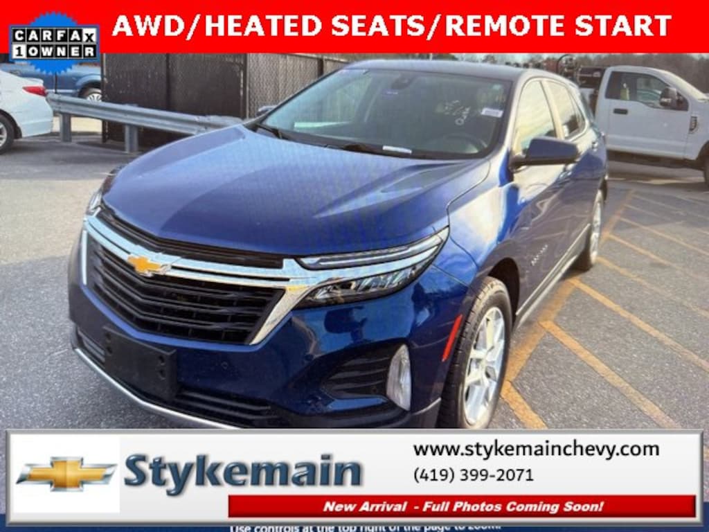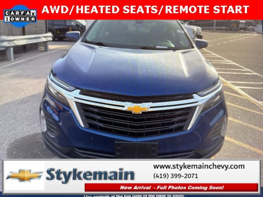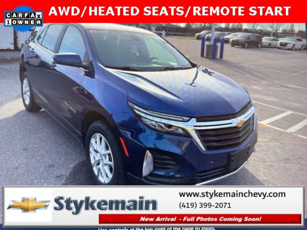 2022 Chevrolet Equinox LT AWD HEATED CLOTH Blue Glow Metallic ** CALL TODAY 419-399-2071 **, ** WI FI **, ** USB ADAPTER **, ** BLUETOOTH **, ** HEATED CLOTH SEATS **, ** APPLE CARPLAY/ANDROID AUTO **, ** REMOTE START **, ** AWD **, ** POWER REAR LIFTGATE **, ** CLEAN VEHICLE HISTORY...NO ACCIDENTS **, ** ONE OWNER **, ** REMAINDER OF FACTORY WARRANTY **, ** ASK US HOW YOU CAN EARN $50 JUST TO TEST THIS VEHICLE! **, *** COMPLEMENTARY 3 MONTH - 3,000 MILE POWERTRAIN WARRANTY ***, Equinox LT AWD HEATED CLOTH, 4D Sport Utility, AWD, Blue Glow Metallic, 3-Spoke Leather-Wrapped Steering Wheel, Confidence & Convenience Package, Driver Confidence II Package, Driver Convenience Package, Dual Zone Automatic Climate Control, Front & Rear Park Assist, Heated Driver & Front Passenger Seats, Lane Change Alert w/Side Blind Zone Alert, Preferred Equipment Group 1LT, Rear Cross Traffic Alert, Rear Power Liftgate, Remote Start. TEST DRIVE ANY USED VEHICLE AND RECEIVE $50. DRIVE A VEHICLE GET $50.NO PRESSURE TO PURCHASE. ACT NOW. ONE GIFT CARD PER HOUSEHOLD PER YEAR.CALL 419-399-2071 TODAY FOR YOUR APPOINTMENT.GO TO WWW.STYKEMAINCHEVY.COM AND FILL OUT YOUR TEST DRIVE FORM. MUST BRING PRINTED FORM WITH YOU TO RECEIVE $50. DON'T FORGET... MOST OF OUR PREOWNED VEHICLES COME WITH A 3 MONTH - 3,000 WARRANTY... FREE OF CHARGE. CONTACT US TO FIND OUT IF THIS ONE QUALIFIES.