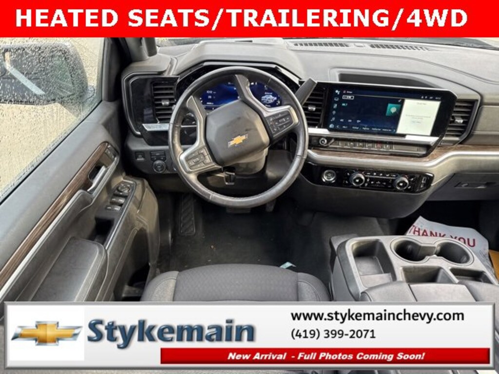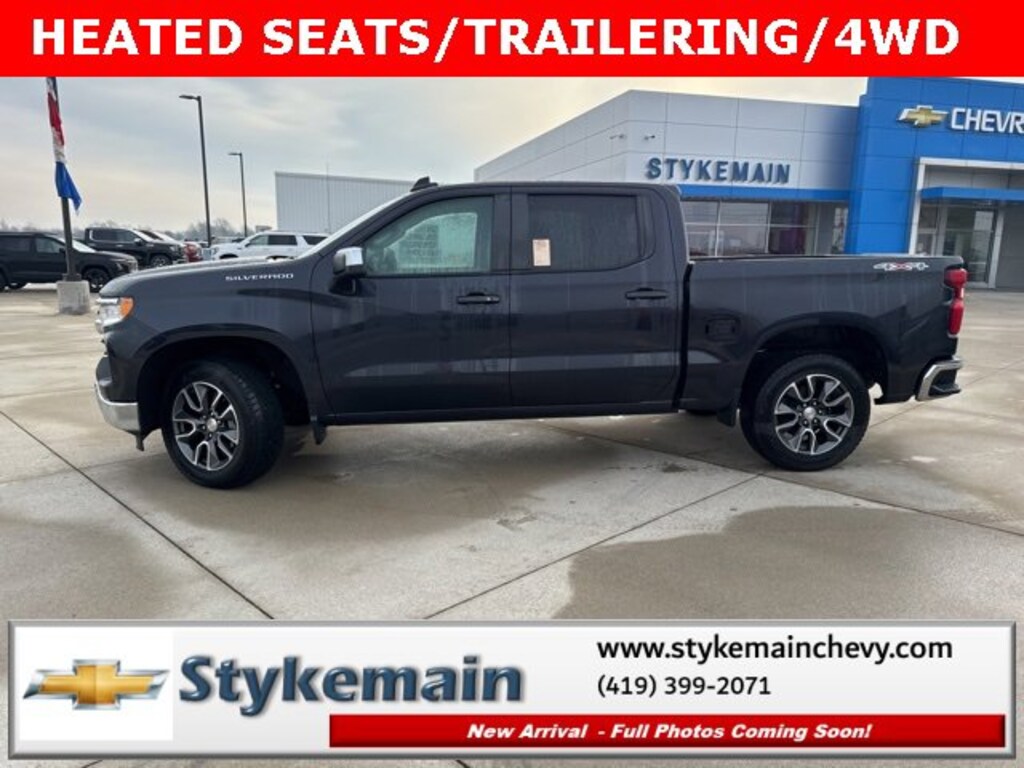 2022 Chevrolet Silverado 1500 LT CREW HEATED SEATS TRAILERING Dark Ash Metallic ** CALL TODAY 419-399-2071 **, ** WI FI **, ** USB ADAPTER **, ** BLUETOOTH **, ** HEATED CLOTH SEATS **, ** HEATED STEERING WHEEL **, ** APPLE CARPLAY/ANDROID AUTO **, ** REMOTE START **, ** 4WD **, ** CLEAN VEHICLE HISTORY...NO ACCIDENTS **, ** ONE OWNER **, ** REMAINDER OF FACTORY WARRANTY **, ** ASK US HOW YOU CAN EARN $50 JUST TO TEST THIS VEHICLE! **, Silverado 1500 LT CREW HEATED SEATS TRAILERING, 4D Crew Cab, 2.7L Turbo, 4WD, Dark Ash Metallic, 10-Way Power Driver Seat w/Lumbar, 12.3 Multicolor Reconfigurable Digital Display, 120-Volt Bed Mounted Power Outlet, 120-Volt Instrument Panel Power Outlet, All-Star Edition, Auto-Locking Rear Differential, Bluetooth® For Phone, Chevrolet Connected Access Capable, Chrome Mirror Caps, Color-Keyed Carpeting Floor Covering, Compass, Convenience Package, Deep-Tinted Glass, Dual Rear USB Ports (Charge Only), Dual-Zone Automatic Climate Control, Electrical Steering Column Lock, Electronic Cruise Control, Front Frame-Mounted Black Recovery Hooks, HD Rear Vision Camera, Heated Driver & Front Outboard Passenger Seats, Heated Steering Wheel, High Capacity Suspension Package, Hitch Guidance, Keyless Open & Start, Leather Wrapped Steering Wheel, LED Cargo Area Lighting, Manual Tilt/Telescoping Steering Column, OnStar & Chevrolet Connected Services Capable, Power Front Windows w/Driver Express Up/Down, Power Front Windows w/Passenger Express Down, Power Rear Windows w/Express Down, Preferred Equipment Group 2FL, Rear 60/40 Folding Bench Seat (Folds Up), SiriusXM w/360L, Standard Suspension Package, Steering Wheel Audio Controls, Trailering Package, Wi-Fi Hot Spot Capable, Wireless Phone Projection. TEST DRIVE ANY USED VEHICLE AND RECEIVE $50. DRIVE A VEHICLE GET $50.NO PRESSURE TO PURCHASE. ACT NOW. ONE GIFT CARD PER HOUSEHOLD PER YEAR.CALL 419-399-2071 TODAY FOR YOUR APPOINTMENT.GO TO WWW.STYKEMAINCHEVY.COM AND FILL OUT YOUR TEST DRIVE FORM. MUST BRING PRINTED FORM WITH YOU TO RECEIVE $50. DON'T FORGET... MOST OF OUR PREOWNED VEHICLES COME WITH A 3 MONTH - 3,000 WARRANTY... FREE OF CHARGE. CONTACT US TO FIND OUT IF THIS ONE QUALIFIES.Stykemain Chevrolet in Paulding, OH is closer than you think. Just take exit 13 off new US 24 to US 127 South. Driving time to Stykemain Chevrolet: Defiance = 15 minutes, Van Wert = 18 minutes, Bryan = 22 minutes, Lima = 42 minutes. Ft Wayne = ONLY 39 MINUTES! COME CHECK US OUT. Visit us online at STYKEMAINCHEVY.COM Proudly serving: Paulding, Defiance, Fort Wayne, Van Wert, Findlay, Toledo, Delphos, Detroit, Indianapolis, South Bend, Elkhart, and all of greater Ohio, Michigan and Indiana.