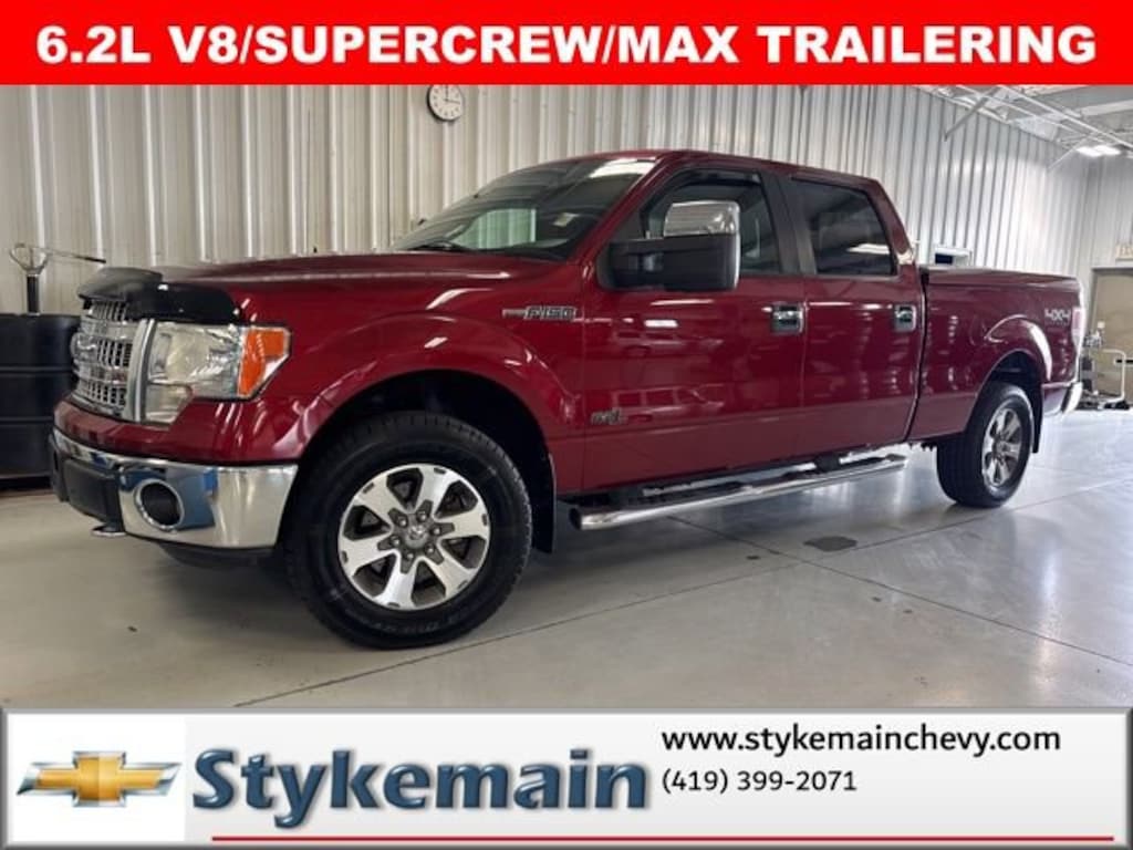 2014 Ford F-150 XLT 6.2L V8 SUPERCREW MAX TRAILERING Ruby Red Metallic ** CALL TODAY 419-399-2071 **, ** ASK US HOW YOU CAN EARN $50 JUST TO TEST THIS VEHICLE! **, ** 4WD **, ** CLEAN VEHICLE HISTORY...NO ACCIDENTS **, *** COMPLEMENTARY 3 MONTH - 3,000 MILE POWERTRAIN WARRANTY ***, F-150 XLT 6.2L V8 SUPERCREW MAX TRAILERING, 4D SuperCrew, 6.2L V8, 4WD, Ruby Red Metallic, 18 Chrome-Clad Aluminum Wheels, 4.2 LCD Productivity Screen in Instrument Cluster, 4x4 Off-Road Decal, 5 Chrome Running Boards, 6-Way Power Driver Seat, Auxiliary Transmission Oil Cooler, Chrome Door Handles w/Black Bezels, Chrome Exhaust Tip, Electronic Locking w/3.55 Axle Ratio, Equipment Group 302A Luxury, Front & Rear Off-Road Tuned Shock Absorbers, GVWR: 7,350 lbs Payload Package, Heated Power Side Mirrors, Hill Descent Control, Leather-Wrapped Steering Wheel, Off-Road Package, Power Adjustable Pedals, Power-Sliding Rear Window w/Defrost & Privacy Tint, Rear-View Camera, Reverse Sensing System, SelectShift Transmission, Self-Dimming Rear-View Mirror, SiriusXM Satellite Radio, SYNC MyFord, Trailer Brake Controller, Trailer Tow Package, Upgraded Radiator, XLT Chrome Package, XLT Convenience Package, XLT Plus Package. TEST DRIVE ANY USED VEHICLE AND RECEIVE $50. DRIVE A VEHICLE GET $50.NO PRESSURE TO PURCHASE. ACT NOW. ONE GIFT CARD PER HOUSEHOLD PER YEAR.CALL 419-399-2071 TODAY FOR YOUR APPOINTMENT.GO TO WWW.STYKEMAINCHEVY.COM AND FILL OUT YOUR TEST DRIVE FORM. MUST BRING PRINTED FORM WITH YOU TO RECEIVE $50. DON'T FORGET... MOST OF OUR PREOWNED VEHICLES COME WITH A 3 MONTH - 3,000 WARRANTY... FREE OF CHARGE. CONTACT US TO FIND OUT IF THIS ONE QUALIFIES.