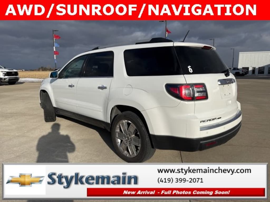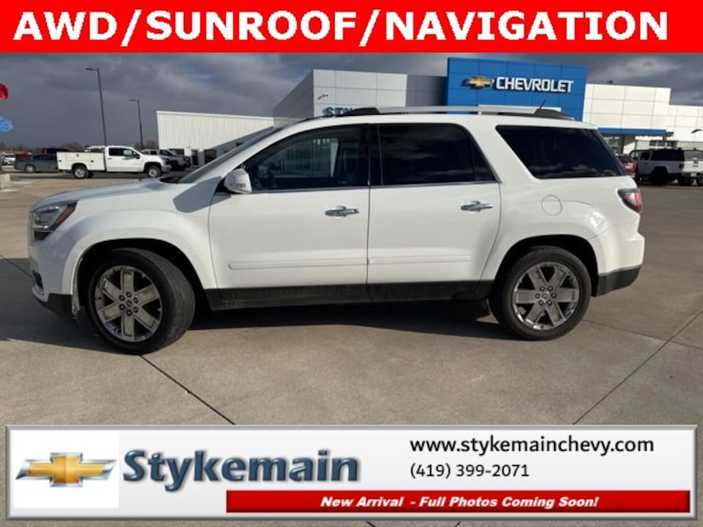 2017 GMC Acadia Limited Limited SUNROOF AWD NAVIGATION Summit White ** CALL TODAY 419-399-2071 **, ** ASK US HOW YOU CAN EARN $50 JUST TO TEST THIS VEHICLE! **, ** SUNROOF **, ** BLUETOOTH **, ** HEATED LEATHER SEATS **, ** SMARTPHONE INTEGRATION **, ** REMOTE START **, ** NAVIGATION **, ** AWD **, ** POWER REAR LIFTGATE **, *** COMPLEMENTARY 3 MONTH - 3,000 MILE POWERTRAIN WARRANTY ***, Acadia Limited Limited SUNROOF AWD NAVIGATION, 4D Sport Utility, 3.6L V6 SIDI, AWD, Summit White, 2-Position Memory For Driver's Seat Adjuster, 8-Way Power Driver Seat w/Memory, 8-Way Power Passenger Seat Adjuster, Body-Color Bodyside Moldings, Bose Premium 10-Speaker Audio System, Electronic Cruise Control w/Set & Resume Speed, Front Halogen Projector Beam Fog Lamps, Heated Leather Wrapped Steering Wheel, Heated Power-Adjustable Outside Mirrors, Inside Rear-View Auto-Dimming Mirror, Leather-Wrapped Steering Wheel, Navigation System, Power Rear Liftgate Body, Power Windows w/Driver Express-Up & -Down, Preferred Equipment Group 4SB, Rear Audio System Controls, Remote Vehicle Start, Side Blind Zone Alert & Rear Cross Traffic Alert, Single Outlet Exhaust, Steering Wheel Mounted Audio Controls, Tilt & Telescopic Steering Column, Tri-Zone Automatic Climate Control, Universal Home Remote, Variable Effort Power Steering. TEST DRIVE ANY USED VEHICLE AND RECEIVE $50. DRIVE A VEHICLE GET $50.NO PRESSURE TO PURCHASE. ACT NOW. ONE GIFT CARD PER HOUSEHOLD PER YEAR.CALL 419-399-2071 TODAY FOR YOUR APPOINTMENT.GO TO WWW.STYKEMAINCHEVY.COM AND FILL OUT YOUR TEST DRIVE FORM. MUST BRING PRINTED FORM WITH YOU TO RECEIVE $50. DON'T FORGET... MOST OF OUR PREOWNED VEHICLES COME WITH A 3 MONTH - 3,000 WARRANTY... FREE OF CHARGE. CONTACT US TO FIND OUT IF THIS ONE QUALIFIES.