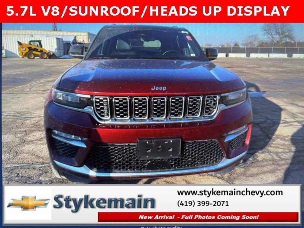 2022 Jeep Grand Cherokee Summit Reserve SUNROOF 5.7L V8 4WD HEADS UP DISPLAY Velvet Red Pearlcoat ** CALL TODAY 419-399-2071 **, ** WI FI **, ** USB ADAPTER **, ** BLUETOOTH **, ** LEATHER **, ** HEATED AND VENTILATED SEATS **, ** APPLE CARPLAY/ANDROID AUTO **, ** REMOTE START **, ** SUNROOF **, ** NAVIGATION **, ** 4WD **, ** POWER REAR LIFTGATE **, ** CLEAN VEHICLE HISTORY...NO ACCIDENTS **, ** REMAINDER OF FACTORY WARRANTY **, ** ASK US HOW YOU CAN EARN $50 JUST TO TEST THIS VEHICLE! **, Grand Cherokee Summit Reserve SUNROOF 5.7L V8 4WD HEADS UP DISPLAY, 4D Sport Utility, HEMI 5.7L V8 Multi Displacement VVT, 4WD, Velvet Red Pearlcoat, Global Black Leather, 19 Speakers High Performance Audio, 950 Watt Amplifier, Active Noise Control System, ADV Protech Group IV, Deluxe Headliner, Front Passenger Interactive Display, Heads-Up Display, Navigation System, Night Vision w/Pedestrian-Animal Detection, Palermo Leather Door Trim, Palermo Leather Seats, Quick Order Package 25U Summit Reserve, Rearview Autodim Digital Display Mirror, Summit Reserve, Summit Reserve Badge, Ventilated Rear Seats, Wheels: 21 x 9 Machined Face/Painted Aluminum. TEST DRIVE ANY USED VEHICLE AND RECEIVE $50. DRIVE A VEHICLE GET $50.NO PRESSURE TO PURCHASE. ACT NOW. ONE GIFT CARD PER HOUSEHOLD PER YEAR.CALL 419-399-2071 TODAY FOR YOUR APPOINTMENT.GO TO WWW.STYKEMAINCHEVY.COM AND FILL OUT YOUR TEST DRIVE FORM. MUST BRING PRINTED FORM WITH YOU TO RECEIVE $50. DON'T FORGET... MOST OF OUR PREOWNED VEHICLES COME WITH A 3 MONTH - 3,000 WARRANTY... FREE OF CHARGE. CONTACT US TO FIND OUT IF THIS ONE QUALIFIES.