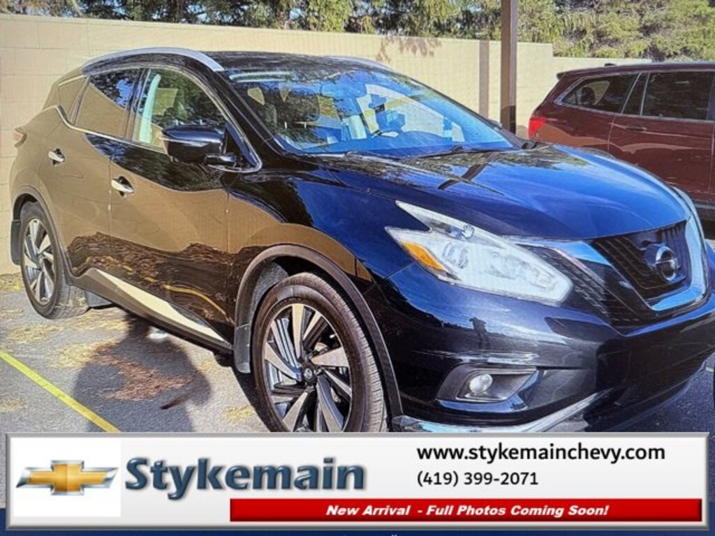 2016 Nissan Murano Platinum AWD SUNROOF ADAPTIVE CRUISE Magnetic Black Metallic ** CALL TODAY 419-399-2071 **, ** USB ADAPTER **, ** BLUETOOTH **, ** ADAPTIVE CRUISE CONTROL **, ** HEATED LEATHER SEATS **, ** SUNROOF **, ** NAVIGATION **, ** 4WD **, ** POWER REAR LIFTGATE **, ** ASK US HOW YOU CAN EARN $50 JUST TO TEST THIS VEHICLE! **, *** COMPLEMENTARY 3 MONTH - 3,000 MILE POWERTRAIN WARRANTY ***, Murano Platinum AWD SUNROOF ADAPTIVE CRUISE, 4D Sport Utility, 3.5L V6 DOHC, CVT with Xtronic, AWD, Magnetic Black Metallic, Intelligent Cruise Control, Navigation System, Platinum Technology Package, Power Panoramic Moonroof, Predictive Forward Collision Warning (PFCW). TEST DRIVE ANY USED VEHICLE AND RECEIVE $50. DRIVE A VEHICLE GET $50.NO PRESSURE TO PURCHASE. ACT NOW. ONE GIFT CARD PER HOUSEHOLD PER YEAR.CALL 419-399-2071 TODAY FOR YOUR APPOINTMENT.GO TO WWW.STYKEMAINCHEVY.COM AND FILL OUT YOUR TEST DRIVE FORM. MUST BRING PRINTED FORM WITH YOU TO RECEIVE $50. DON'T FORGET... MOST OF OUR PREOWNED VEHICLES COME WITH A 3 MONTH - 3,000 WARRANTY... FREE OF CHARGE. CONTACT US TO FIND OUT IF THIS ONE QUALIFIES.Stykemain Chevrolet in Paulding, OH is closer than you think. Just take exit 13 off new US 24 to US 127 South. Driving time to Stykemain Chevrolet: Defiance = 15 minutes, Van Wert = 18 minutes, Bryan = 22 minutes, Lima = 42 minutes. Ft Wayne = ONLY 39 MINUTES! COME CHECK US OUT. Visit us online at STYKEMAINCHEVY.COM Proudly serving: Paulding, Defiance, Fort Wayne, Van Wert, Findlay, Toledo, Delphos, Detroit, Indianapolis, South Bend, Elkhart, and all of greater Ohio, Michigan and Indiana.