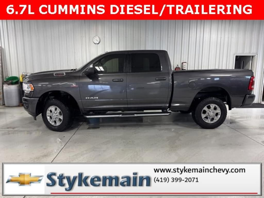 2022 Ram 2500 Big Horn CUMMINS HEATED SEATS NAVIGATION SPORT APPEARANCE Granite Crystal Metallic Clearcoat ** CALL TODAY 419-399-2071 **, ** ASK US HOW YOU CAN EARN $50 JUST TO TEST THIS VEHICLE! **, ** BLUETOOTH **, ** HEATED STEERING WHEEL **, ** HEATED CLOTH SEATS **, ** REMOTE START **, ** NAVIGATION **, ** 4WD **, ** DIESEL **, ** CLEAN VEHICLE HISTORY...NO ACCIDENTS **, *** COMPLEMENTARY 3 MONTH - 3,000 MILE POWERTRAIN WARRANTY ***, ** USB ADAPTER **, FRONT BUCKET SEATS, BEDLINER, RUNNING BOARDS, LED BED LIGHING, PREMIUM SOUND SYSTEM, 2500 Big Horn CUMMINS HEATED SEATS NAVIGATION SPORT APPEARANCE, 4D Crew Cab, Cummins 6.7L I6 Turbodiesel, 4WD, Granite Crystal Metallic Clearcoat, 115V Auxiliary Front Power Outlet, 115V Auxiliary Rear Power Outlet, 2 Way Rear Headrest Seat, 2nd Row In Floor Storage Bins, 4 Way Front Headrests, 40/20/40 Split Bench Seat, 400W Inverter, Air Conditioning ATC w/Dual Zone Control, Auto-Dimming Rear-View Mirror, Black Interior Accents, Body Color Door Handles, Body Color Grille Surround, Center Hub, Center Stack Storage Drawer, Cluster 7.0 TFT Color Display, Dampened Tailgate, Dual Glove Boxes, Exterior 115V AC Outlet, Foam Bottle Insert (Door Trim Panel), Folding Flat Load Floor Storage, Footwell Courtesy Lamp, Front Armrest w/Cupholders, Front Center Seat Cushion Storage, Front Fog Lamps, Front Seat Back Map Pockets, Glove Box Lamp, GPS Navigation, Heated Front Seats, Heated Steering Wheel, Leather Wrapped Steering Wheel, LED Tail Lamps, Level C Equipment Group, Locking Lower Glove Box, Manual Adjust 4-Way Front Passenger Seat, Media Hub w/2 Charge Only USBs, Painted Front Bumper, Painted Rear Bumper, ParkSense Front/Rear Park Assist System, Power 2-Way Driver Lumbar Adjust, Power Adjust 8-Way Driver Seat, Power Adjustable Pedals, Premium Cloth 40/20/40 Bench Seat, Protection Group, Quick Order Package 2HZ Big Horn, Rear 60/40 Folding Seat, Rear Dome w/On/Off Switch Lamp, Rear Power Sliding Window, Rear Window Defroster, Remote Start System, Security Alarm, Sport Appearance Package, Sport Decal, Steering Wheel Mounted Audio Controls, Storage Tray, Sun Visors w/Illuminated Vanity Mirrors, Universal Garage Door Opener, Wheels: 18 x 8.0 Polished Aluminum. TEST DRIVE ANY USED VEHICLE AND RECEIVE $50. DRIVE A VEHICLE GET $50.NO PRESSURE TO PURCHASE. ACT NOW. ONE GIFT CARD PER HOUSEHOLD PER YEAR.CALL 419-399-2071 TODAY FOR YOUR APPOINTMENT.GO TO WWW.STYKEMAINCHEVY.COM AND FILL OUT YOUR TEST DRIVE FORM. MUST BRING PRINTED FORM WITH YOU TO RECEIVE $50. DON'T FORGET... MOST OF OUR PREOWNED VEHICLES COME WITH A 3 MONTH - 3,000 WARRANTY... FREE OF CHARGE. CONTACT US TO FIND OUT IF THIS ONE QUALIFIES.